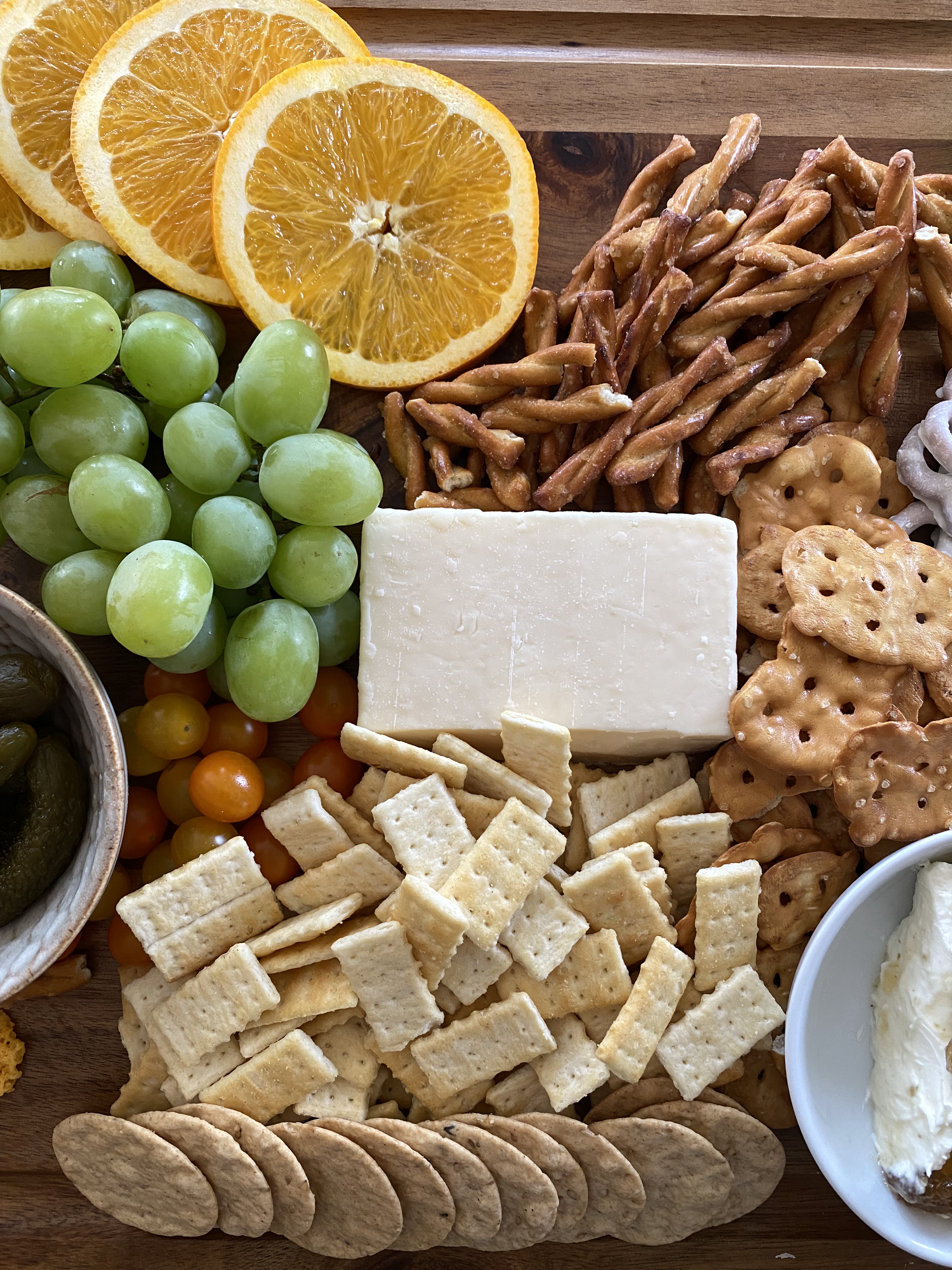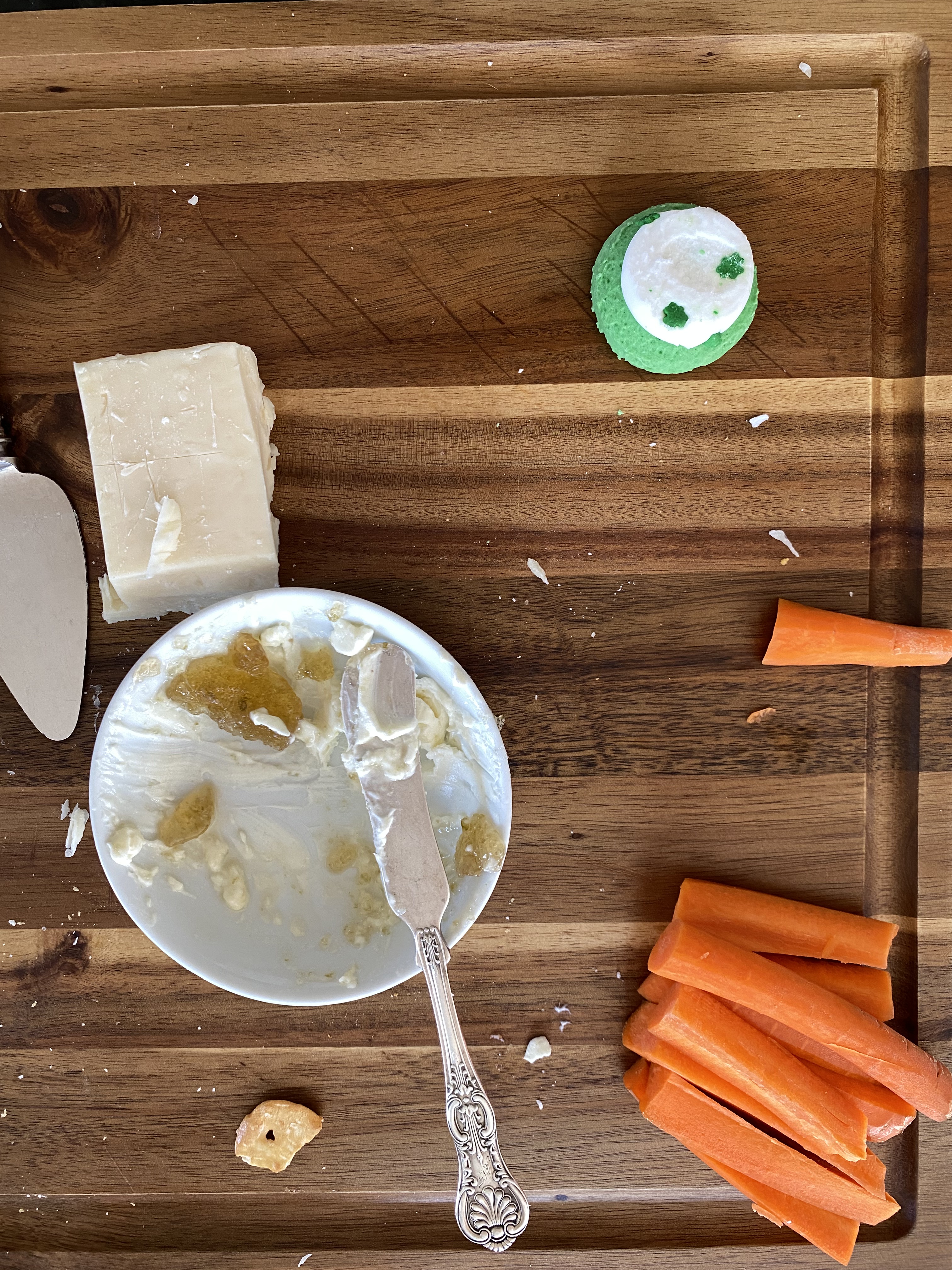 today, we were just trying to get the kids fed quickly, so we combined all the foods onto the board as we typically do with no particular layout in mind. if you wanted to recreate this board exactly, start with the block of hard cheese in the middle as a main focal point, then work outward mixing the colors of foods around the board (in this case green, white + orange/colors of the irish flag); next time we will probably play around with creating an irish flag shape by grouping the foods by color.