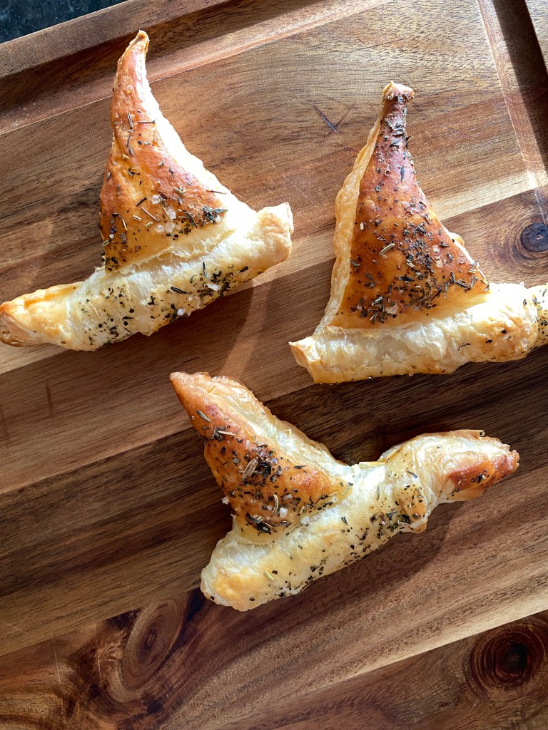 we made these twice, once with crescent roll dough + another with puff pastry. crescent roll dough comes preforated in triangular shapes which makes this about as easy as it gets for a quick afterschool snack with little to no prep. these are easy to make + pair *so well* with just about anything else you may put on a healthy snack board, so they are a win in my book. refrigerated dough will give you a finished product similar to a biscuit, while puff pastry will result in a more flaky, layered finish.