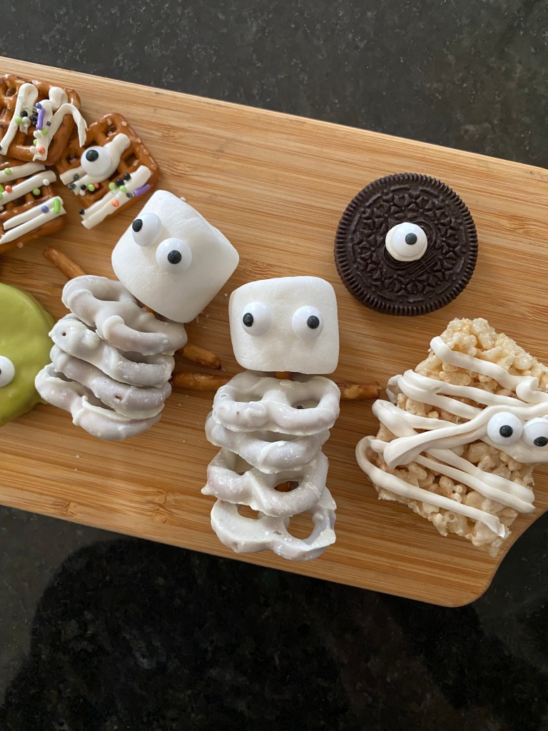 add the candy eyes quickly, before candy begins to harden; here’s where we have fun with number of eyes: some monsters have 1, mummy’s have 2 tucked into their gauze, while others have 3 or more; let your kids help!