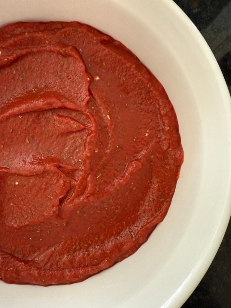 mix tomato sauce, tomato paste, dried herbs + garlic powder.
